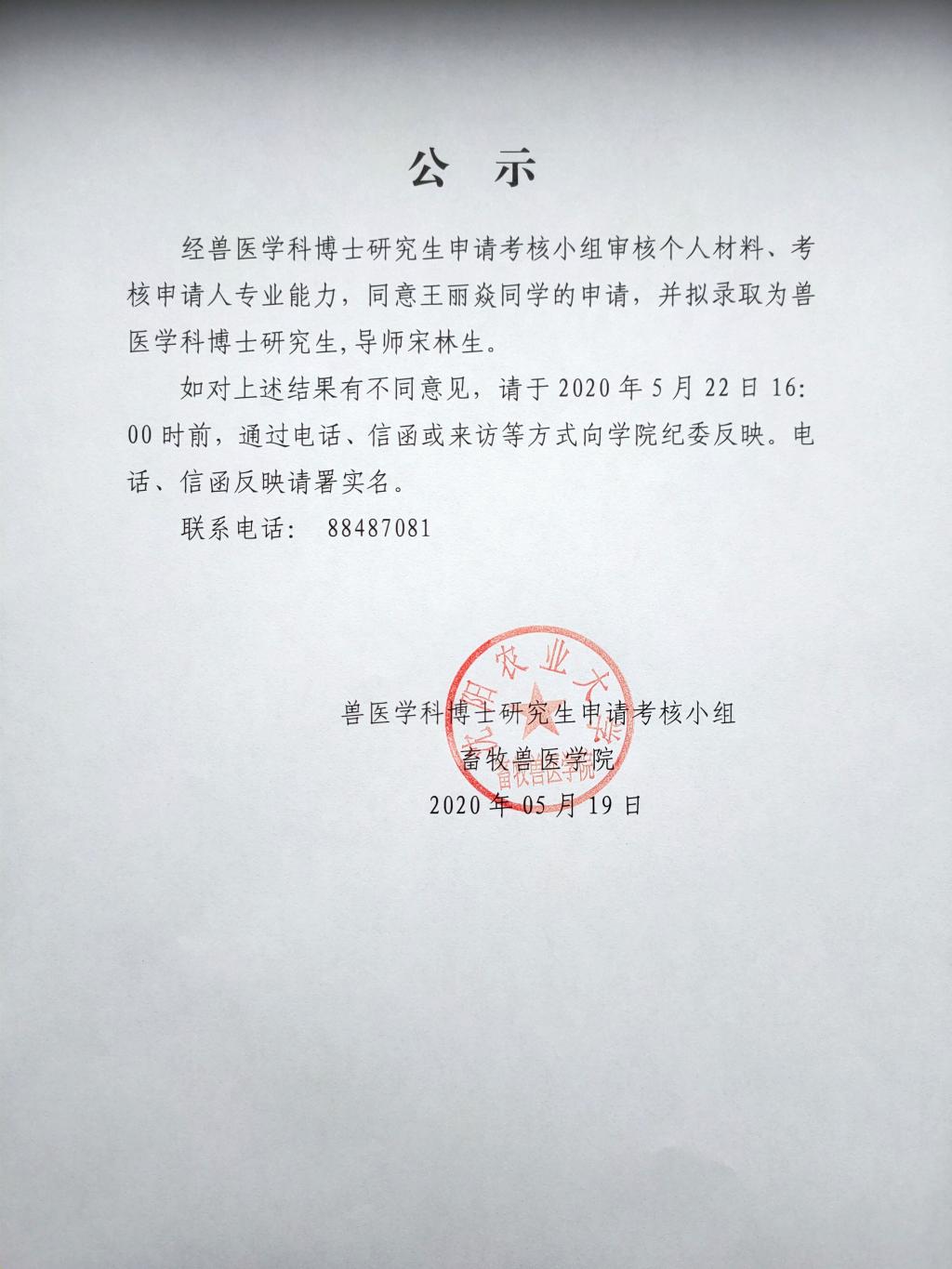 关于拟录取王丽焱同学为兽医学科博士研究生的公示