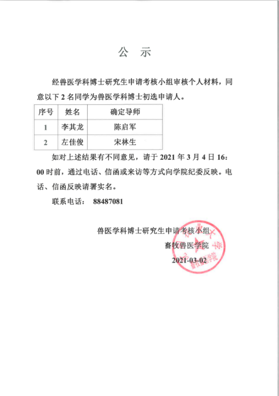 关于李其龙、左佳俊同学拟进入兽医学科申请考核制博士初选申请人名单的公示