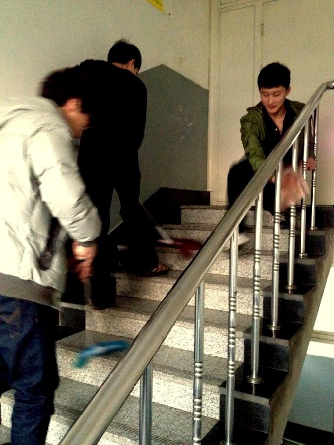 寒假过后,寝室楼道积满了尘土,3月7日,13级动医2班的同学自发的组织清扫楼道,擦洗楼梯扶手,为大家提供了良好的生活学习环境,美化了寝室的生活环境。